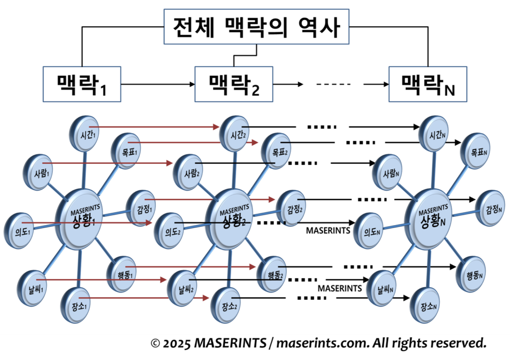 MASERINTS에서는 이에 대해 내가 남긴 어떤 흔적(Vestige)이 가지고 있는 패턴, 아주 미세하고 작은 신호나 단서가 될 수 있는 어떤 행동이나 움직임, 제스처, 몸짓, 얼굴표정 등을 포함할 수 있다. 그리고 내 마음이 지금 어떻게 움직이고 있는지, 그런 인지적인 상태도 포함하게 되는데, 그것은 내 성격도 감정도, 그렇다고 오래 간직해 온 어떤 나의 특성도 아니라 현재 나의 마음, 생각의 상태를 포함한다는 것이다. 예를 들어서 일상적인 삶의 흐름에서 내 마음이 무엇인가에 집중하고 있다든가, 내 마음이 계속 다른 것에 쏠리면서 주의가 산만하다든가, 내 마음에 담긴 어떤 의미나 생각을 정리할 수 없을 정도로 혼란스러움을 가지고 있다든가, 너무 해야 할 일이 많거나 갑자가 많은 량의 정보나 Input이 수행되어 오히려 마음이 느려지게 되는 과부하 상태에 있다든가, 아니면 내 마음 속에서 무엇인가 파헤치고, 탐험하고 싶어하는 호기심이 가득한 상태에 있다든가, 아니면 내 마음이 무엇인가를 자세히 살펴보고, 그것을 이해하거나 고치려고 시도하는 어떤 문제를 해결하려는 그런 상태에 있다든가, 내 마음이 다음 단계를 준비하고 있는 무엇인가를 계획하는 상태에 있다든가, 내 마음이 지난 나의 과거 경험과 기억을 더듬어보며 무엇인가 기억하려는 상태에 있든가, 내가 지금 새롭게 접한 어떤 대상과의 새로운 연결을 형성하기 위해 배우려는 상태에 있든가, 이런 것들이 모두 나의 인지적인 상태에 해당되는 것이다. 여기서 중요한 것은 “순간순간”이란 표현인데, 아주 짧은 순간에 가지는 나의 정신 상태를 포함한다고 볼 수 있다. 또한 MASERINTS에서는 내가 남긴 전체 맥락적인 의미를 포함할 수도 있다. 즉, 그림과 같이 상황이 가지고 있는 맥락과 그런 맥락이 현재까지 가지로 있는 역사적인 정보를 포함하고 있다는 것이다.