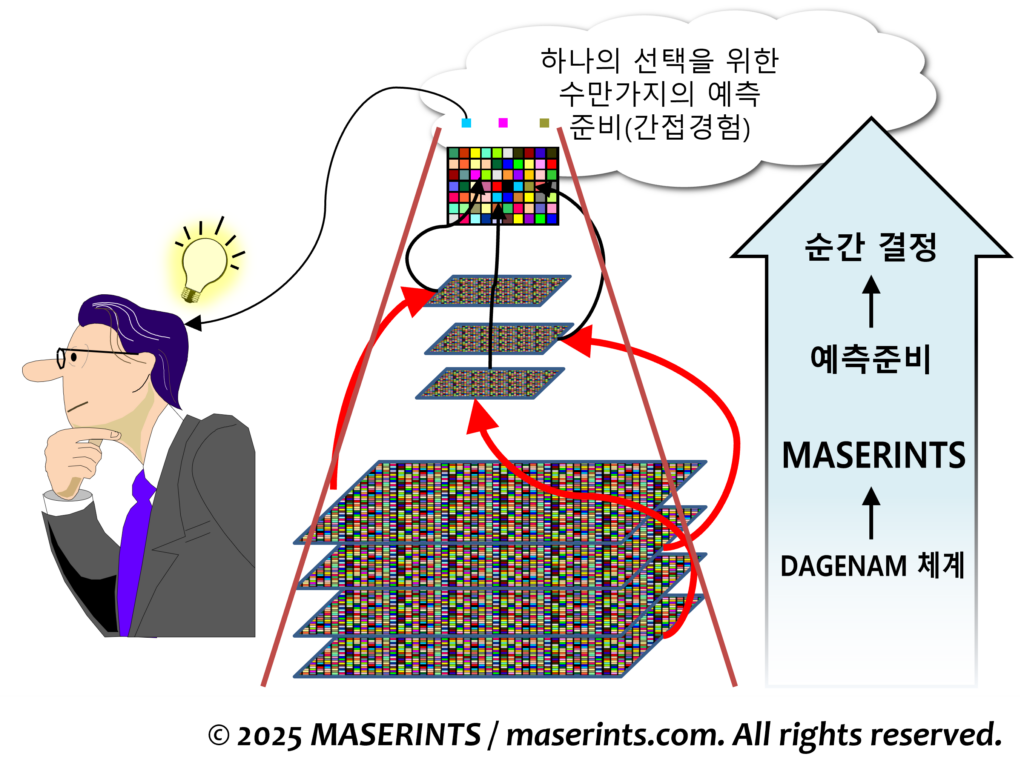 다음의 그림은 수많은 예측된 지원과 도움이 MASERINTS에 의해 매 순간 준비되고, 매우 짧은 순간이 지나 점점 PTS가 최종적으로 필요하거나 원하는 순간까지 수도 없이 예측된 지원과 도움이 걸러질 것이고, 가장 적절한 순간에, 적절한 장소에 단 한 가지의 지원과 도움이 제공된다는 것을 보여준다.