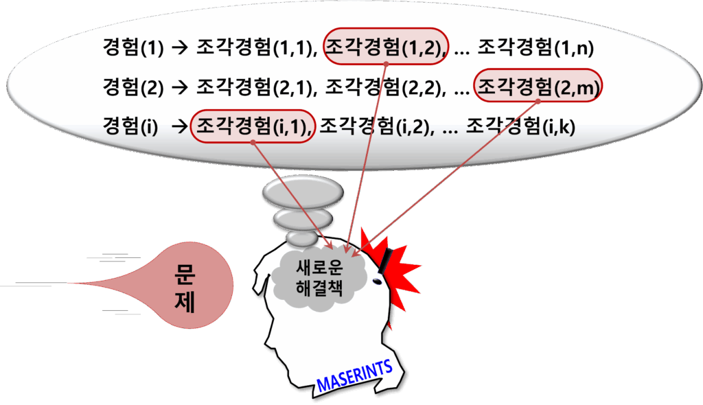 이렇게 ‘간접경험’을 미래의 ‘직접경험’처럼 변환시키는 일을 효과적으로 하기 위해서 우선 먼저 가능한 많은 ‘단위경험’이나 ‘조각경험’을 발견해야 하고, 그로 인해서 많은 ‘간접경험’을 만들 수 있어야 한다. 내가 기억하고 있는 모든 경험을 끄집어 내서 ‘간접경험’을 만들기 위해 ‘단위경험’을 발견한다는 것은 불가능할지도 모르기 때문에 그래서 이런 느낌을 기억의 시뮬레이션을 통해 잠시 맛보려고 하는 것이고, 중요한 것은 내가 생각만으로 한다면 불가능하겠지만, 이것을 MASERINTS는 나를 위해 모든 ‘단위경험’이나 ‘조각경험’을 찾아낼 수 있다는 것이다.