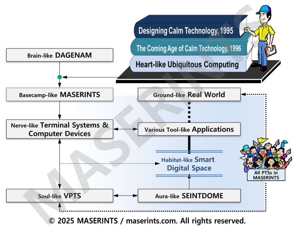 MASERINTS는 Mark Weiser의 Vision 정신을 실현하려는 현대적인 시도를 품고 있는 개념적 디자인을 보여준다. 사람들을 화면이나 디바이스 속으로 깊이 끌어들이는 것이 아니라, 인간의 욕구를 감지하고, 해석하며 부드럽게 반응하는 주변 환경을 조성하는 것에 중점을 둔다. Mark Weiser의 Calm Technology처럼 MASERINTS는 방해하지 않으면서도 서비스를 제공하고, 부담스럽지 않으면서도 정보를 제공하며, 삶의 배경에 자연스럽게 녹아들기를 추구한다. 그래서 MASERINTS는 ‘사용자’라는 표현을 사용하지 않고 PTS(Person to be served)라고 해서 알아차리든 알아차리지 못하든지 서비스를 받는 중심에 있는 주인공을 나타내며, MASERINTS는 과거와 달리 점점 PTS의 입장으로 그 안에 내가 존재할 확률이 많아진다.