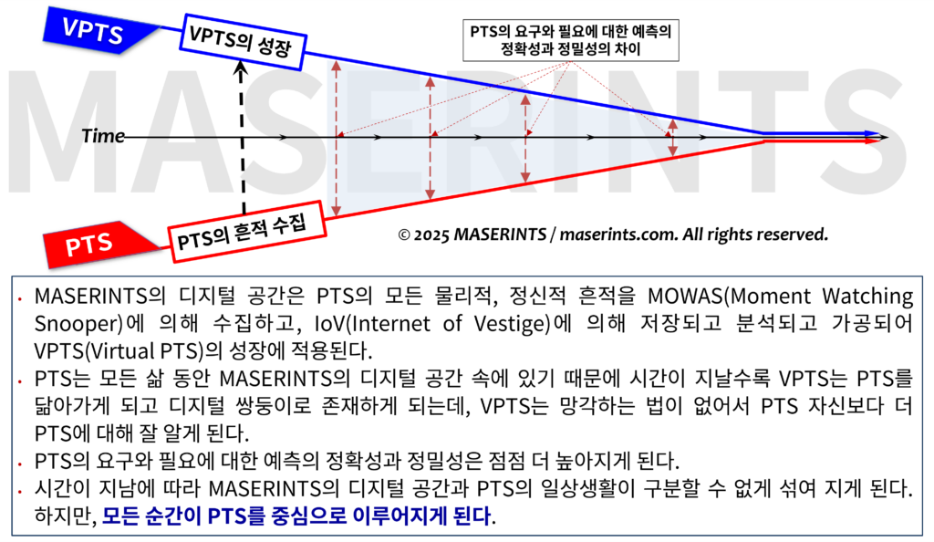 MASERINTS라는 디지털 공간은 잘 보이지도 않고, 느껴지지도 않지만, 나보다 나를 더 잘 알고 있고, 나와 같은 그런 디지털 쌍둥이인 VPTS로 성장하게 될 것이다. 그래서 성장한다는 표현은 PTS를 꼭 닮은 살아있는 디지털 공간으로 변하게 된다는 것이다. 이런 MASERINTS가 집사와 같은 동반자가 되어 어떤 순간이라도 PTS에게 필요한 그런 지원과 도움을, 정확히 필요한 시점에, 정확한 장소에서 정확히 필요한 것 만을 주기 위해 존재하게 된다.