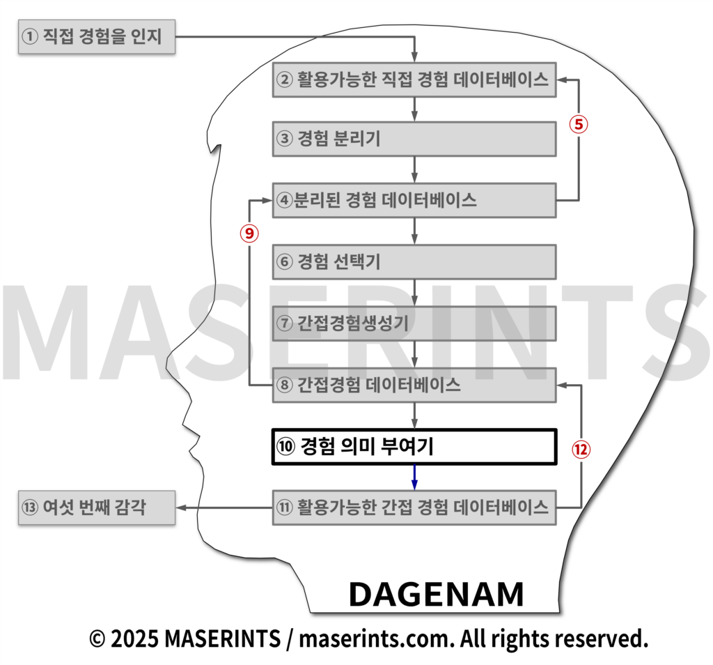 그리고 두뇌에서는 하나의 기억이 다른 저장된 느낌이나 자국들과 합쳐져 솟아오르기도 하고, 때로는 변형되고 풍부하게 되어, 새로운 통찰력과 연결되어 또 하나의 새로운 것으로 돌아오기도 한다. 협곡에서 소리치면 소리는 무엇인가에 부딪혀서 모양이 바뀌면서 메아리로 자기 자신과 겹쳐 되돌아오듯이, 나의 마음속에서 과거의 기억과 경험이라는 벽에 부딪히고, 되돌아오는 것은 원래 경험에는 없었는데, 나중에 기억을 나타날 수 있는 의미, 감정 또는 연관성이 추가된 새로운 의미를 지니게 된다는 것이다. 이것이 DAGENAM에서는 ‘간접경험’이 되는 것이고, 이러한 새롭게 의미가 부여된 ‘간접경험’의 창출은 DAGENAM에서 매우 어려운 프로세스 중의 하나가 될 것이다. 이 작업을 하는 것이 ‘경험의미부여기(Experience Meaning Grantor)’라는 프로세스이다.