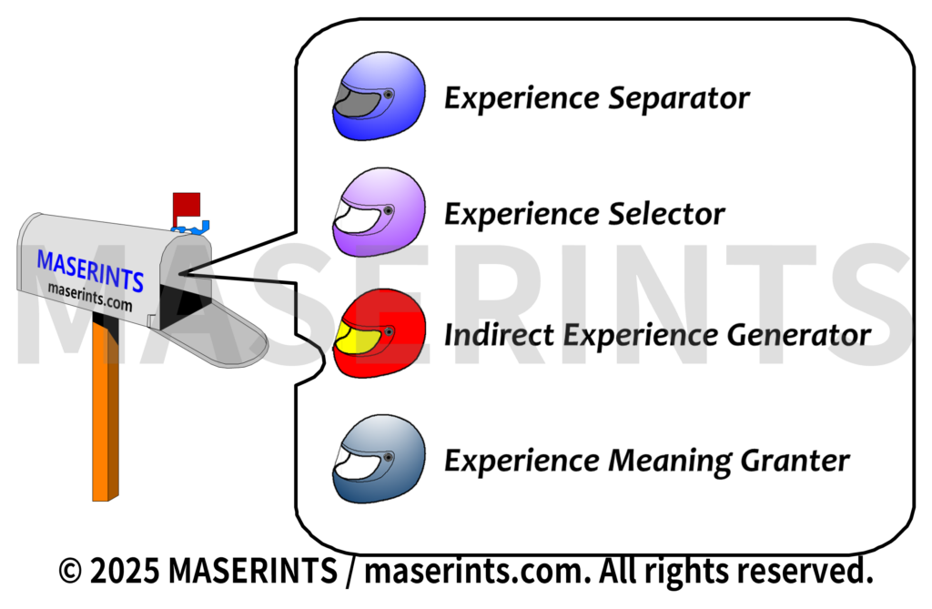 그래서 소위 사람들이 가질 수 있는 ‘여섯 번째 감각’이라는 것은 DAGENAM에서 보면 이 ‘간접경험생성기’의 결과일 수 있다는 것이다. 이렇게 생성된 ‘간접경험’은 MASERINTS의 디지털 공간에서 지원과 도움을 받아야 할 주인공인 PTS(Person to be served)에게 정확한 시점에 정확한 장소에서 딱 알맞은 지원과 도움을 제공하는데 중요한 역할을 한다.