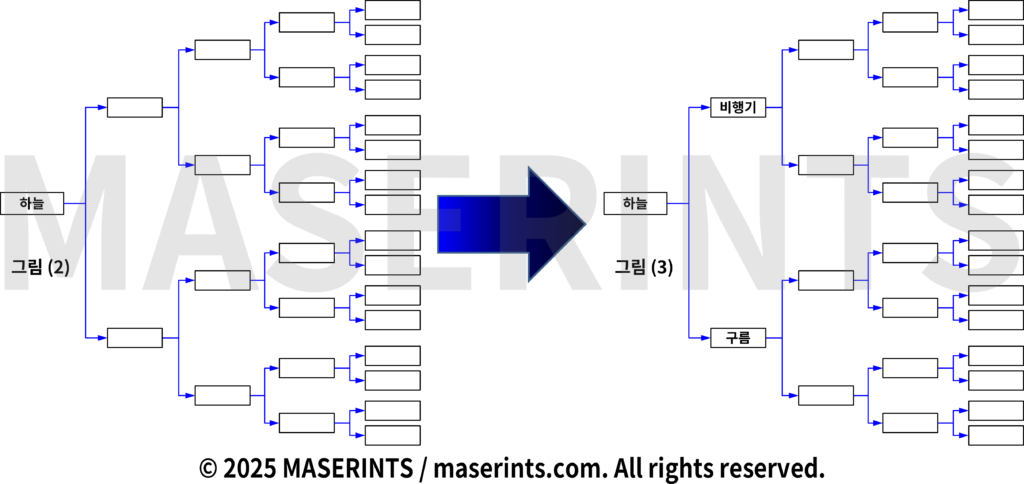 그림처럼 하나의 단어가 만일 ‘하늘’이란 단어라면, 그림(2)처럼 될 것이다. 그러면 다음 단계는 화살표를 따라 하늘과 연관된 단어 두 개를 생각해서 하나는 연결된 하나의 박스에 또 하나는 다른 박스에 적게 된다.