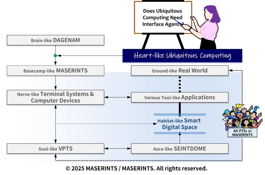 Mark Weiser는 컴퓨팅이 사람들의 관심과 주의력 또는 생각이 집중되는 순간을 요구하는 것을 원하지 않았다. MASERINTS는 인터페이스를 디지털 공간 속으로 사라지게 하여 PTS가 명령이나 디지털 에이전트와의 끊임없는 협상이 아닌, 그냥 PTS의 존재, PTS가 일상적 생활을 하면서 하는 모든 음성, 움직임, 제스처, 몸짓과 PTS의 주변 맥락을 통해 자연스럽게 상호작용할 수 있도록 함으로써 동일한 방식을 취할 수 있다. 그렇기 때문에 MASERINTS는 디지털 공간 자체가 듣고, 이해하고 도와주는 살아있는 동반자 역할을 하는 공간이 될 것이며, 이것은 Mark Weiser가 언젠가 기술이 그렇게 되기를 바랐던 것과 같이 듣고 이해하고 돕는 공간으로 구현되는 것이다.