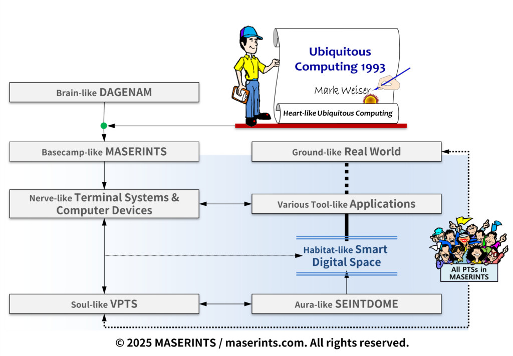 MASERINTS의 디지털 공간은 이러한 비전을 계승한다. 1990년 당시 Mark Weiser 박사가 상상조차 하지 못했던 현재의 기술적 가능성과 개념적 접근 방식을 가능하게 함으로써, MASERINTS는 그의 아이디어를 계승하는 것을 넘어 확장할 기회를 제공한다. “Calm Computing”, “Invisible Computing”이라는 Mark Weiser 박사의 꿈을 그가 예상하지 못했던 형태로 구현하기 위해 개념설계가 진행되고, Mark Weiser 박사가 컴퓨팅이 언젠가 도달하기를 바랐던 정신을 온전히 담아내고 있다.
